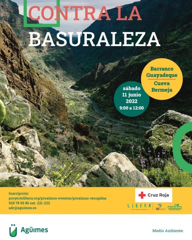 Desde el Ayuntamiento de Agüimes, con la colaboración y participación del área de conocimiento de Medio Ambiente de Cruz Roja Española, se organizó una limpieza en el espacio natural protegido del Barranco de Guayadeque, con motivo de la 6ª Campaña "1m2 contra la basuraleza". A la actividad de limpieza y sensibilización asistieron, Pedro Florido, Director Provincial de Medio Ambiente de Cruz Roja Española; las concejalas de Medio Ambiente, Jardines y Residuos, Jéssica Santana, Juani Martel y Adela Alemán, acompañados por una veintena de voluntarios/as de Protección Civil Agüimes, voluntarios de Cruz Roja y vecinos/as del municipio y otros lugares de Gran Canaria.