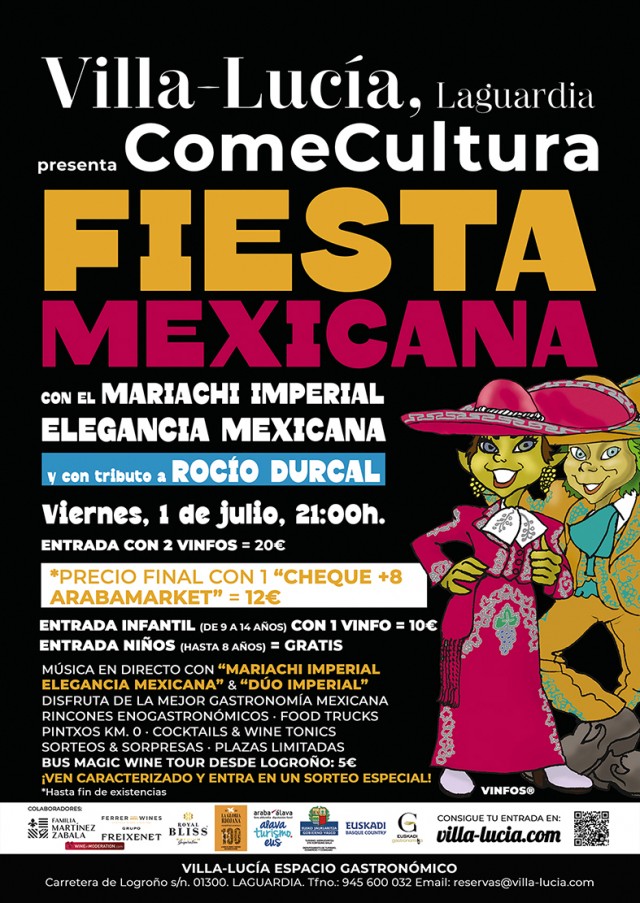 De Rioja Alavesa... ¡a México! Esta es la segunda de las fiestas de la nueva e ilusionante etapa de 'ComeCultura', el original proyecto con el que Villa-Lucía propone un emocional maridaje entre la enogastronomía local y KM.0 y la cultura; en este caso la música. Y lo hace al son de rancheras, con el Dúo Imperial y el Grupo Mariachi Imperial Elegancia Mexicana, que ofrecerá un tributo a nuestra inmortal Rocío Durcal en la voz de Joina, quien interpretará temas inolvidables como 'Me gustas mucho', 'Tarde' o 'Así son los hombres'. Todo ello, mientras se saborean los deliciosos platos propuestos para la velada. Pero además, con el aliciente económico añadido de los cheques descuento '+8 ArabaMarket'. El verano arranca en Villa-Lucía al son una gran 'Fiesta mexicana'