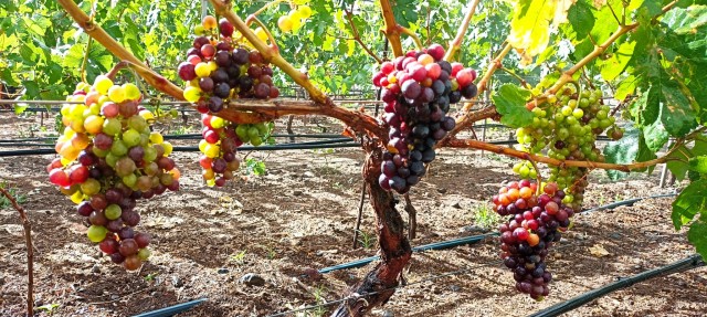 Normalmente el envero empieza en la zona de viñedos en Los Corralillos. De todos modos, el envero es muy irregular y suele ser antes en las viñas viejas, con poca producción y uvas más concentradas. Es muy emocionante cuando por primera vez te encuentras un racimo con algunas bayas ya tintadas.