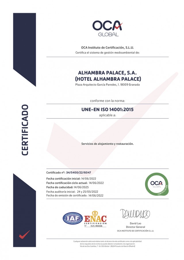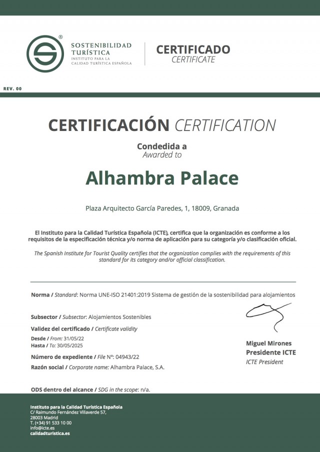 El centenario 5* granadino acredita una doble certificación: ISO 14001 de Medio Ambiente e ISO 21401 de Sostenibilidad