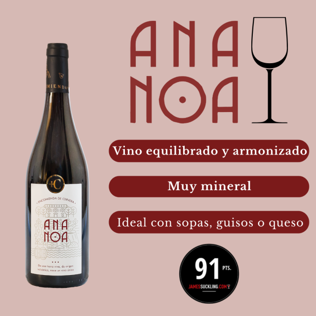 Ananoa Syrah 2019, es un vino de color rojo picota con aromas intensos a frutas rojas y toques a caramelo debido al envejecimiento en barricas de roble francés. Además, es muy mineral debido a su terreno. Un vino con gran cuerpo, fácil de beber, con un largo y agradable retrogusto.