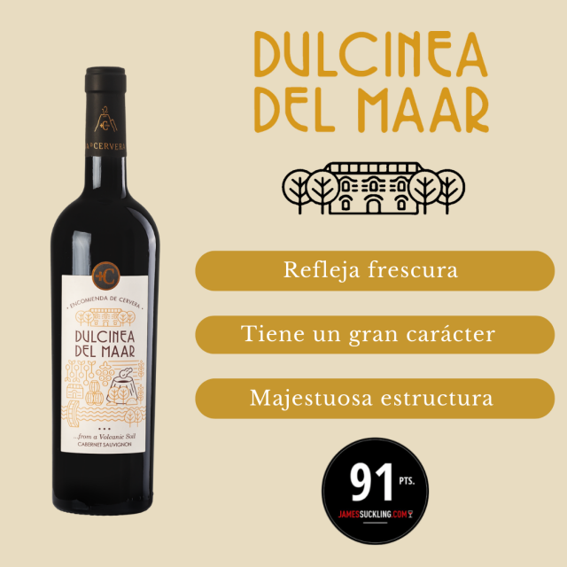 Dulcinea del Maar Cabernet Sauvignon 2018, un vino de pigmento oscuro, con aroma intenso y pleno, muy frutal. Respecto al gusto, cuenta con una majestuosa estructura, con notas a pimiento verde atenuado y sensaciones a pimentón. Finos taninos suaves perfilados por el roble limpio.
