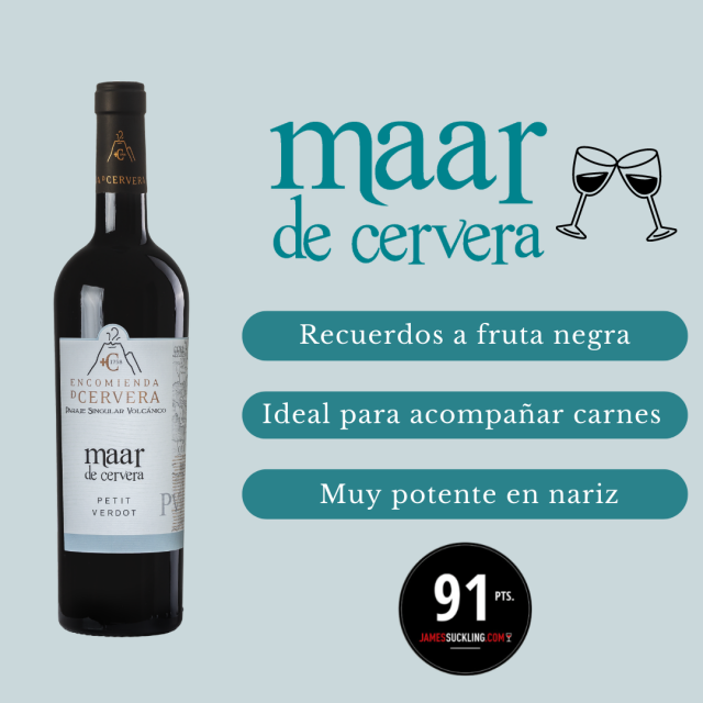Maar de Cervera Cabernet Sauvignon 2018, con un color granate perfecto que se mantiene sin oxidación, respecto a los aromas, es un vino muy limpio, con notas ahumadas y de chocolate negro. De gran intensidad, pleno y afrutado, pudiendo sentir el auténtico carácter del suelo volcánico de donde proviene. Marida perfectamente con el tapeo de calidad y comidas basadas en carnes y salseados de carne.