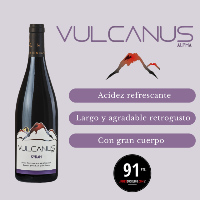 Vulcanus Syrah 2019, posee un gran color rojo. El suelo volcánico contribuye a la expresión mineral y la acidez refrescante de este vino, con aromas muy fuertes a frutas rojas y toques de caramelo ya que el envejecimiento se hace en barricas de roble francés.
