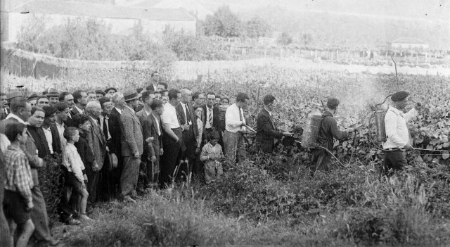 La demostración de la fotografía (tomada por Chao en Santo Domingos, en el Ribeiro en 1933 y procedente de los fondos del Museo del Vino de Galicia) capta el asombro de los labradores y asistentes -muchos de ellos niños que habrían que llevar una petaca máquina sobre las espaldas el resto de su vida- cuando contemplaron por primera vez el pesado aparato y su chorro difusor.