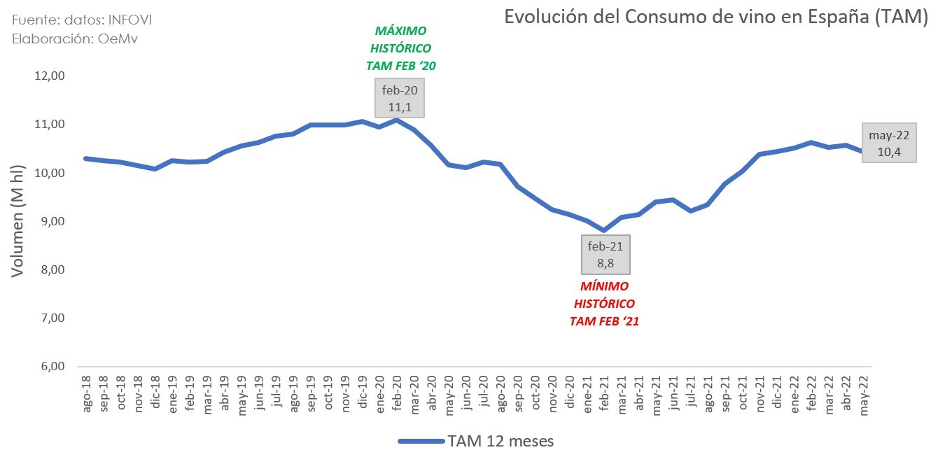 El informe, elaborado por el Observatorio Español del Mercado del Vino (OeMv) a partir de los datos de INFOVI, señala que el consumo de vino en España creció en el TAM a mayo de 2022 un 11,1%, hasta alcanzar los 10,44 millones de hectolitros.
