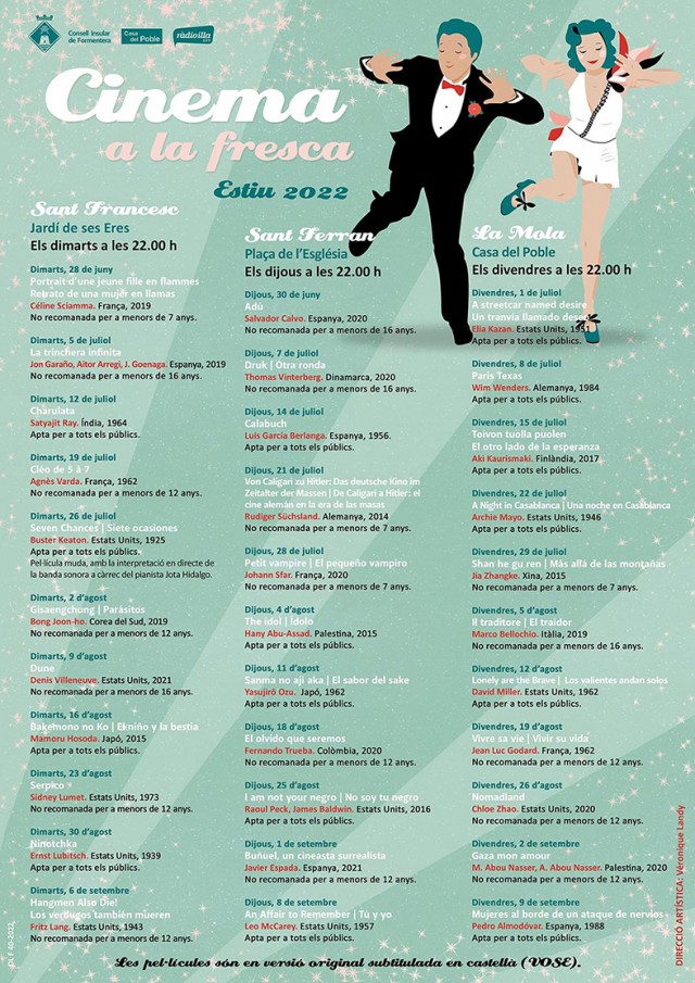 La capital insular transforma el Jardí de ses Eres (detrás de la iglesia) en una improvisada platea de cine. El 30 de agosto se proyectará un clásico de los primeros años del cine, 'Ninotchka', comedia romántica dirigida por Ernst Lubitsch en 1939, con la mítica Greta Garbo convertida agente comunista enviada a París. Y el 6 de septiembre, 'Los verdugos también mueren', dirigida en 1943 por Fritz Lang y protagonizada por Brian Donlevy y Walter Brennan, ambientada en la Segunda Guerra Mundial.