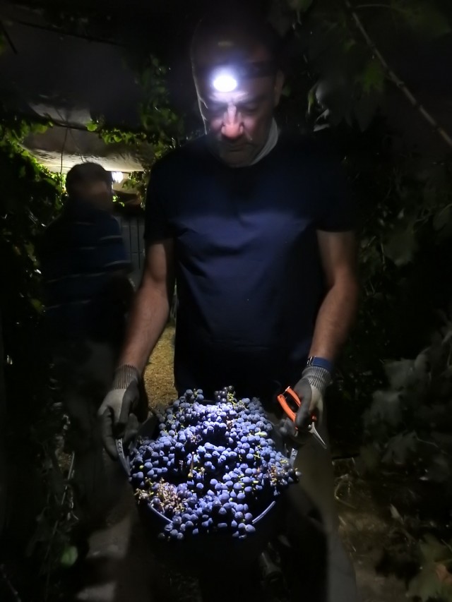 Es aún de noche. Desde un lugar de Agüimes Casco, Los Alberconcillos está rodeado de oscuridad. De repente, unos fogonazos iluminan la Finca Viñas La Junquera. El bullido que se escucha es la familia del viticultor Sebastián Ortega y amigos que pasan entre las hileras de la parcela recogiendo la uva a mano. A más de 270 metros de altura, los viñedos están expuestos a una gran diferencia entre días soleados y noches frescas. Un clima que ha contribuido a forjar el carácter de la tintilla que madura con posterioridad a la listan negro.