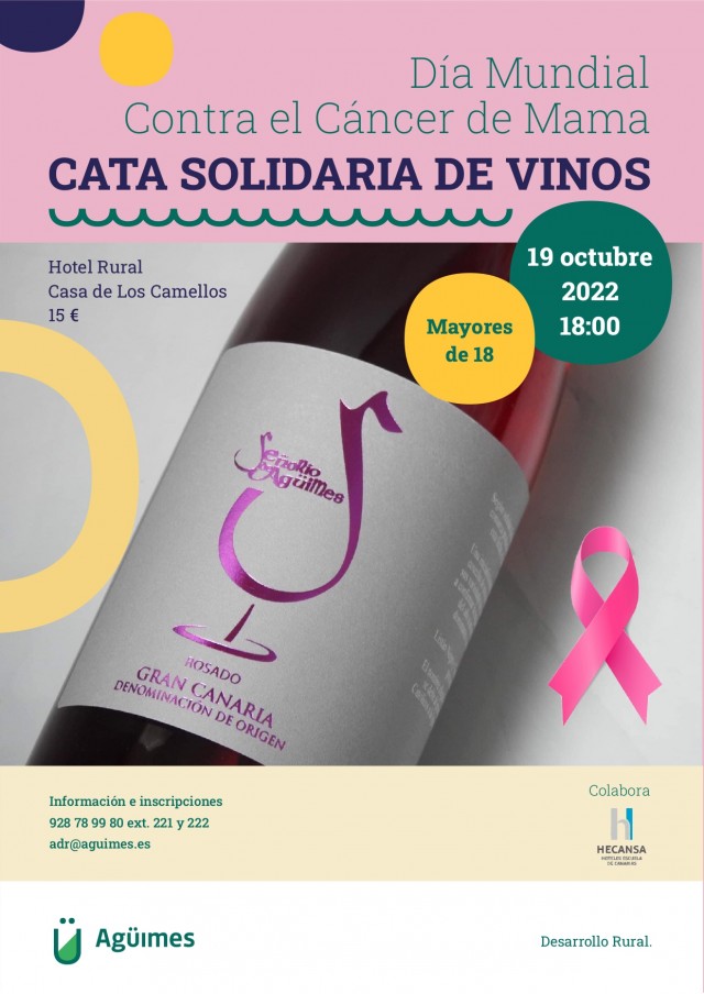 La Bodega Municipal de Agüimes, gestionada por la empresa pública Turismo Rural y las áreas de Salud, Desarrollo Local y Desarrollo Rural del Ayuntamiento de Agüimes organizan una cata de vinos solidaria con motivo del Día Mundial del Cáncer de Mama, colaboran en esta iniciativa solidaria la Asociación Española contra el Cáncer y el Hotel Rural Casa de Los Camellos – HECANSA.