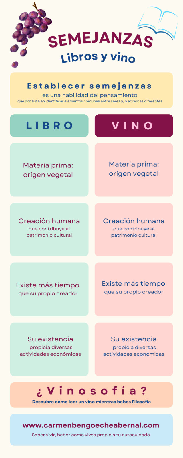 En la imagen que he creado para ti, te muestro las semejanzas entre ambos. Desde sus orígenes hasta que llegan a la comunidad lectora y/o vinófaga, los libros y los vinos tienen en común a sus creadores humanos y son la causa de diversas actividades económicas. Los libros y los vinos son creaciones universales tanto por tiempo como por espacio, los encontramos en diferentes culturas. Ambos son casi eternos, sobreviven a sus creadores y nos hacen dialogar con ellos en cierta forma. ¿Qué más vinculaciones encuentras entre ellos?