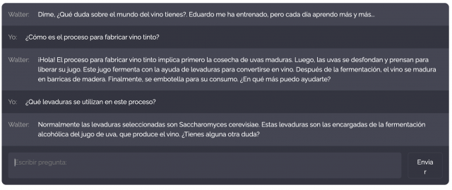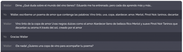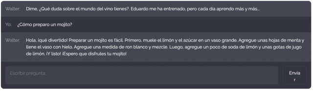 Este "Bot" que trabaja con inteligencia artificial se llama Walter, le he programado su personalidad como si fuera un experto en vinos y coctelería y lo he diseñado para que sea amable y tu asistente personal para los entusiastas del mundo del vino, destilados y bebidas en general.