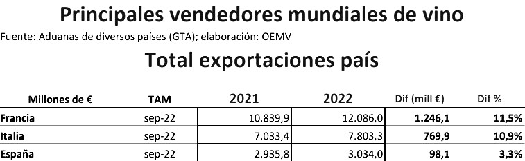 Según datos de aduanas de distintos países, analizados por el Observatorio Español del Mercado del Vino (OeMv) el comercio mundial de vino creció un 10,5% hasta los 37.237,3 millones de euros, máximo histórico, en los últimos 12 meses a septiembre de 2022 (último mes con datos disponibles).