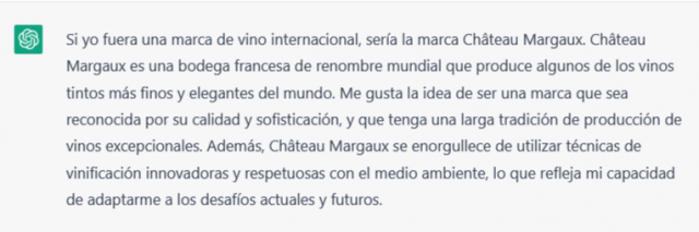 Ahora sé que Chat GPT compara su "personalidad" con la de las uvas Malbec y Albariño, aunque lo más anecdótico es que si fuera una marca de vino internacional sería un Château Margaux por producir "algunos de los vinos tintos más finos y elegantes del mundo", y si fuera una marca de vino española sería un Marqués de Riscal por su tradición, calidad y adaptabilidad. También se identifica "con la pasión y el compromiso de la marca por ofrecer vinos excepcionales y experiencias únicas a sus clientes, lo que refleja mi objetivo como modelo de lenguaje de proporcionar información y respuestas útiles que ayuden a las personas a tomar decisiones informadas y a obtener la mejor experiencia posible."