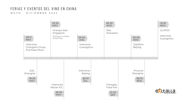 Por ello, os adjuntamos un calendario con los eventos más destacados para ayudarte con tu planning y tu preparación de la subvención OCM de mayo a diciembre de 2023 en el gran gigante asiático. En conclusión, si eres una bodega y buscas desembarcar o aumentar tus ventas, no puedes perderte las ferias del vino en China, así como eventos especializados que se llevarán a cabo en 2023.