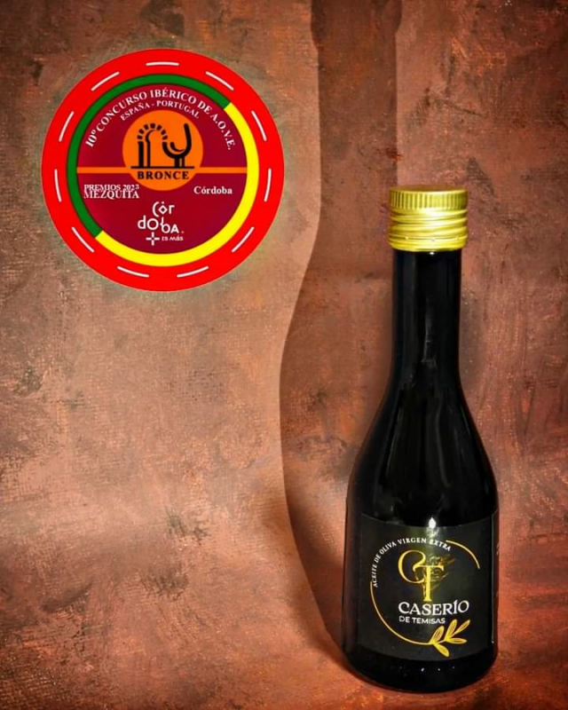 El Aceite de Oliva Virgen Extra "Caserío de Temisas" logra una medalla de bronce en el X Concurso Ibérico de AOVE 2023 - PREMIOS MEZQUITA, celebrado en Beja (Portugal), obtiene 77 puntos en la categoría de frutado maduro. El nuevo diseño ya incluye además la mención especial a la mejor imagen y presentación de Canarias obtenida en el Concurso Oficial de Aceites de Oliva.