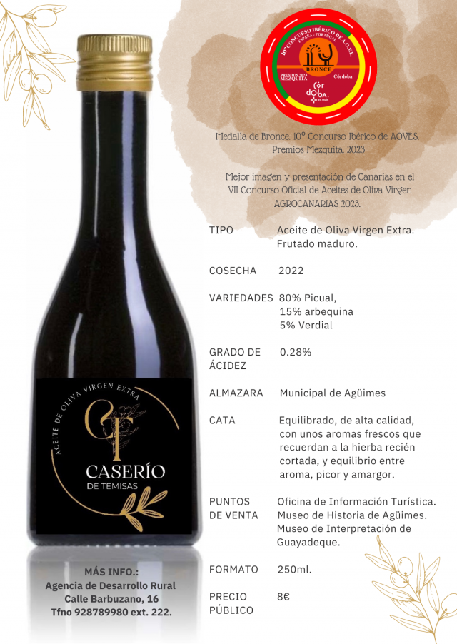 Este aceite premiado AOVE Caserío de Temisas 2022, fue elaborado por la Agencia de Desarrollo Rural de Agüimes, con la última cosecha de los agricultores locales, llega a los consumidores con un remozado formato mucho más atractivo, lo que contribuye a mejorar su posicionamiento en el mercado. El color amarillo característico del aceite, que remite también al sol del sureste grancanario, tiene un papel central en la nueva etiqueta, en el logo y en el envase de 250 mililitros. El moderno diseño incluye además la mención especial a la mejor imagen y presentación obtenida por la marca Caserío de Temisas en el Concurso Oficial de Aceites de Oliva.