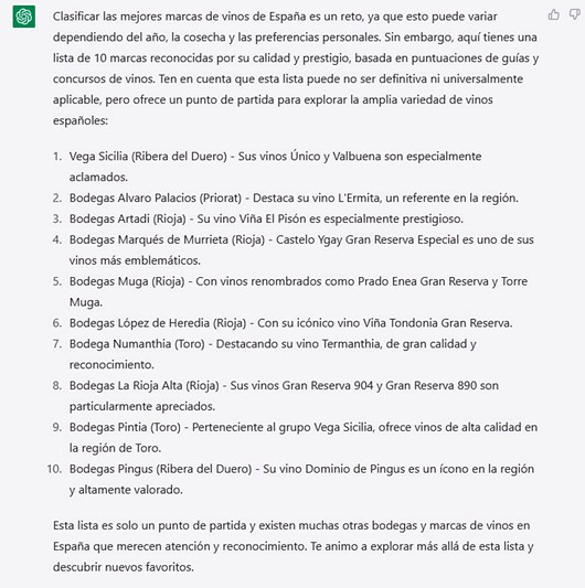 ChatGPT: Clasificar las mejores marcas de vinos de España es un reto, ya que esto puede variar dependiendo del año, la cosecha y las preferencias personales. Sin embargo, aquí tienes una lista de 10 marcas reconocidas por su calidad y prestigio, basada en puntuaciones de guías y concursos de vinos. Ten en cuenta que esta lista puede no ser definitiva ni universalmente aplicable, pero ofrece un punto de partida para explorar la amplia variedad de vinos españoles: