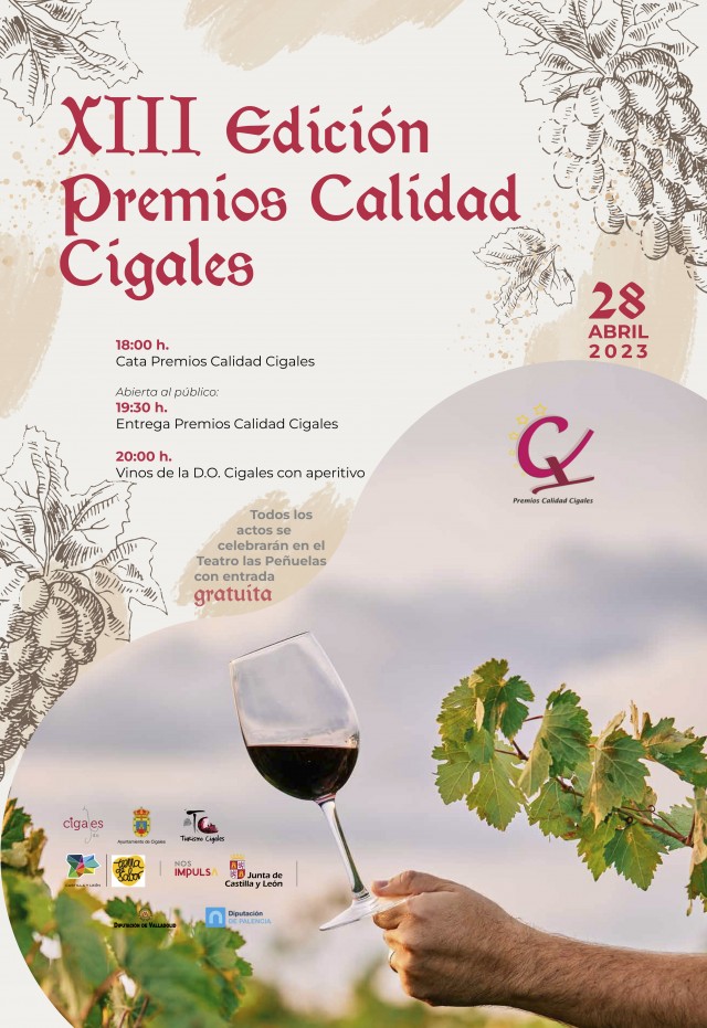 El próximo viernes 28 de abril en el Teatro Las Peñuelas de Cigales el Consejo Regulador de la D.O. Cigales organiza en colaboración con el Ayuntamiento la XIII edición de sus Premios Calidad Cigales donde se hará entrega de los galardones al mejor vino blanco, rosado, tinto joven con menos de 6 meses en barrica y tinto con más de 6 meses en barrica de la comarca de Cigales.