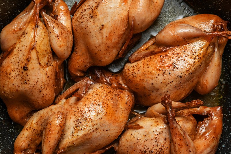 Sazona las codornices con sal, pimienta, romero y tomillo picados. Una vez que las tengas especiadas, fríelas en una cazuela con un poco de aceite a fuego fuerte, dejándolas 2 minutos por cada lado para marcarlas, es decir que cojan color dorado intenso. Cuando las tengas listas, retíralas del fuego.