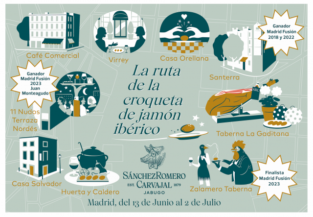 La ruta de la croqueta de Jamón ibérico de Sánchez Romero Carvajal surge tras el éxito del IX Campeonato de la Mejor Croqueta de jamón ibérico organizado por Madrid Fusión el pasado mes de enero con la colaboración de la marca originaria de Jabugo. Con este recorrido, Sánchez Romero Carvajal acerca a los amantes de la gastronomía española este bocado de alta cocina elaborado con jamón de bellota 100% ibérico Sánchez Romero Carvajal de algunos de los establecimientos participantes en las últimas ediciones: 11 Nudos Terraza Nordés- trae desde Ababol la croqueta ganadora de 2023 de Juan Monteagudo, Zalamero- finalista 2023, Santerra- ganador de las ediciones de 2018 y 2022. Junto a ellos, otros referentes de la gastronomía española como Casa Salvador, Casa Orellana, Huerta y Caldero, Taberna la Gaditana, Café Comercial y Virrey con una propuesta de croquetas de jamón Sánchez Romero Carvajal que conquistarán a los más foodies de la capital.