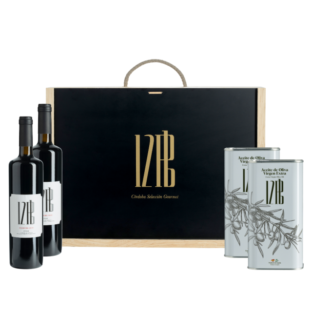 Los estuches de lujo premium contenían: dos botellas de Vino Tinto 12Pb 100% Syrah y dos latas de 1L de Aceite de Oliva Virgen Extra Coupage Gran Sabor 12Pb.