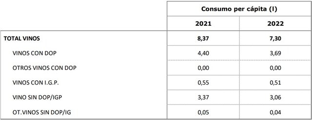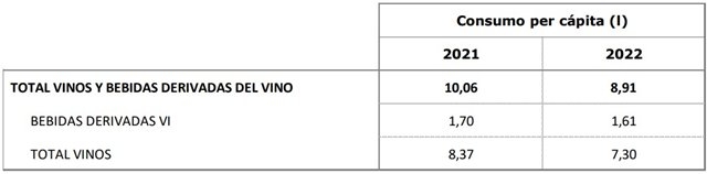 En promedio, cada ciudadano español consumió 8,91 litros de vino y bebidas derivadas del vino en 2022, lo que significa una disminución del 11,5% respecto a 2021. En otras palabras, cada individuo consumió 1,16 litros menos que el año anterior. Este descenso en el consumo ha afectado tanto a los vinos como a las bebidas derivadas del vino, con un consumo individual a finales de 2022 de 7,30 y 1,61 litros por persona respectivamente.