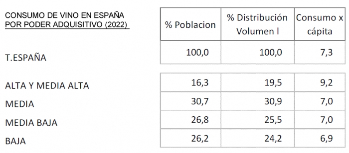 Al observar más de cerca el perfil del consumidor de vino en el hogar, se descubren patrones interesantes. El consumo intensivo de vino se concentra, en términos de clase socioeconómica, en hogares de clase alta/media-alta y clase media, cuyo consumo en volumen supera su representación en la población. El consumo per cápita de vino se sitúa en 7,3 litros por persona al año, siendo los hogares de clase alta y media alta los únicos que superan este promedio, con un consumo de 9,2 litros por persona y periodo de estudio.