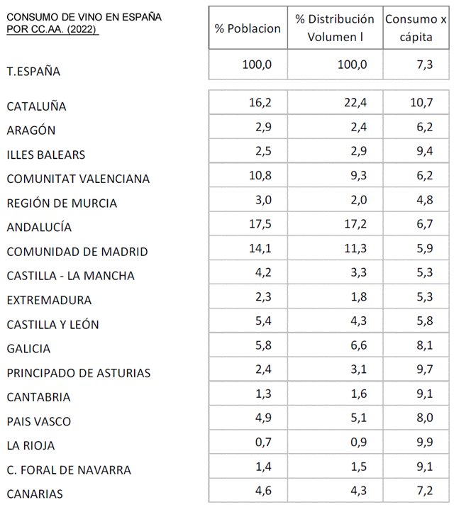 A nivel regional, Cataluña destaca como la comunidad autónoma más intensiva en el consumo de vinos, superando su media poblacional en un 38,0%. También es la comunidad con un mayor consumo per cápita, con 10,7 litros por persona y año, superando la media nacional de 7,3 litros. Otras comunidades autónomas intensivas en la compra de vino son Asturias, Cantabria, Islas Baleares y Galicia. A nivel individual, estas regiones, junto a Navarra y al País Vasco, superan la media nacional. Por el contrario, encontramos comunidades como Extremadura, Castilla La Mancha, la Comunidad de Madrid o la Región de Murcia, que son menos intensivas en su consumo, al tener una proporción de consumo inferior a la que correspondería por población. Además, estas regiones presentan un consumo per cápita inferior.