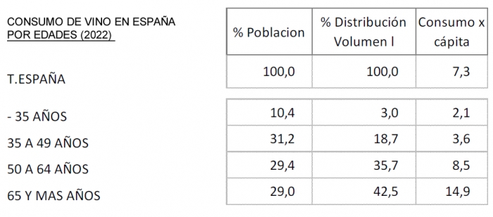 En cuanto a la edad del responsable de las compras, se constata que son los mayores de 50 años, y especialmente los mayores de 65, los que conforman el perfil de consumidor intensivo de vino. Este último grupo realiza el mayor consumo per cápita en la categoría, con un consumo medio de 14,9 litros por persona al año.