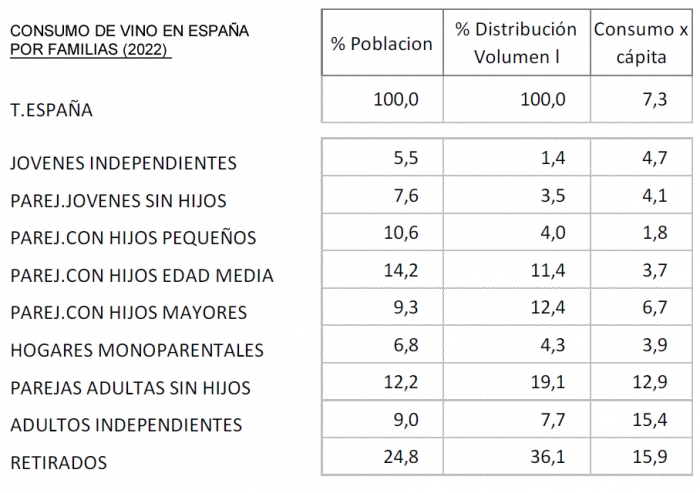 El perfil intensivo en la compra de esta bebida se identifica en hogares formados por parejas adultas sin hijos, retirados o parejas con hijos mayores. El consumo per cápita supera la media nacional en los hogares formados por parejas adultas sin hijos, y con hijos mayores y retirados. Los retirados son quienes realizan la mayor ingesta, con 15,9 litros por persona y periodo de análisis.