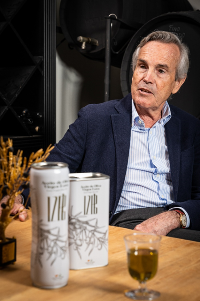 Foto: D. Eugenio Sánchez Ramade, presidente de la Bodega 12Pb, mostrando diferentes formatos de Aceite de Oliva Virgen Extra 12Pb.
