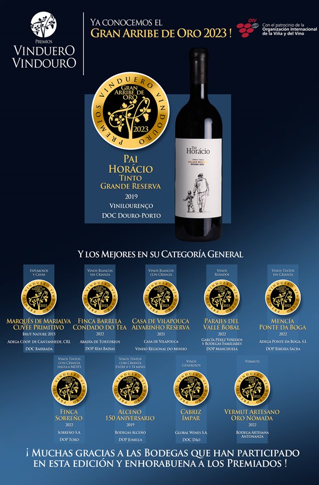 De todos los presentados, el vino portugués 'Pai Horacio Tinto Grande Reserva' de Vinilourenço, de la DOC Douro-Porto, ha sido el vino que ha logrado la máxima puntuación por parte del Comité Internacional de Cata, obteniendo así el Gran Arribe de Oro, y coronándose como el mejor vino de la Península Ibérica.