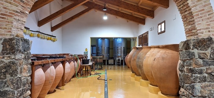 Con el referente del trabajo en el campo, visitamos la bodega. Un espacio de reciente creación (2017) pensado tanto en la elaboración del vino como en acoger al visitante. Son las elaboraciones en tinaja el sello característico de los vinos de Las Calzadas con los que Daniel recupera la tradición en la zona. Vinos que buscan pureza, mostrarse directos, tal y como los elaboraban sus antecesores en tiempos pasados. Dentro de la oferta de enoturismo, Las Calzadas ofrece esta misma experiencia que os transmito de visita a varias localizaciones y al viñedo, y que se complementa con la cata de sus vinos y el disfrute de la gastronomía en su restaurante. Un local dentro de un espectacular "cubo", lo que en la vecina Mancha se conoce como "bombo", o en otras zonas, Rioja por ejemplo, "guardaviñas". Un espacio con encanto en el que disfrutar de productos de cercanía acompañados por los vinos de la bodega. Experiencia que recomiendo encarecidamente.