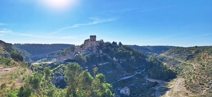 Continúo ruta, mi primer contacto directo con el Río Júcar es en el embalse de Alarcón, una presa de vital importancia para el suministro constante de agua a los campos visitados, para en pocos kilómetros llegar a la bonita población de Alarcón. Dos viñedos flanquean el camino de entrada, todo me hace pensar que pertenecen a la vecina Manchuela. La entrada a esta población únicamente se puede realizar por su parte este. Su localización geográfica en un meandro del Júcar lo hace casi inaccesible por otro sito que no sea éste, por ello la importancia que en el pasado tuvo tanto para los árabes como, posteriormente, para los cristianos. Su castillo es su mayor atractivo, una fortaleza que ordenó construir Alfonso VIII y que hoy recibe al visitante como parador. En el castillo de Villena puede uno alojarse, disfrutar de la gastronomía conquense y contemplar desde sus almenas las vistas al Júcar. Alarcón además tiene un importante patrimonio monumental, varias iglesias y miradores, un museo con murales,..etc. y varios locales, además del parador, para disfrutar de la gastronomía y del vino. Elijo un lugar tranquilo, un jardín, El Jardín Escondido, quienes acaban de iniciar su andadura este agosto de 2023, para relajarme entre naturaleza con el sonido del agua de fondo mientras disfruto de una tabla variada de quesos de la zona acompañada por un vino blanco de la Ribera del Júcar. Ahora toca descansar, mañana más.....
