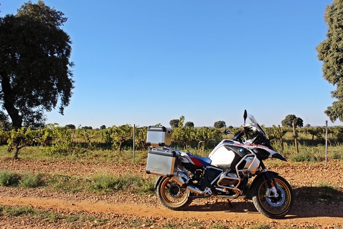Tras entrevistar a Juancho, me acompaña durante parte de la ruta para disfrutar juntos del placer de viajar en moto. Menudo salto generacional y tecnológico hay entre la Kawasaki Gpz 550 de finales los años 80 con la BMW R 1250 GS del 2023, un mundo, aunque lo importante en este caso no son los años, sino más bien el espíritu, y eso nos vale para compartir un buen rato juntos. No hay duda de que el vino une a las personas, y las motos también. Me deja en el camino de entrada a mi siguiente visita, me despido de Juancho y me sumerjo por caminos de tierra en los que los viñedos copan las vistas y los tractores laborean en la distancia. Tras disfrutar del paisaje que me ofrece el camino llego a Bodegas Illana.