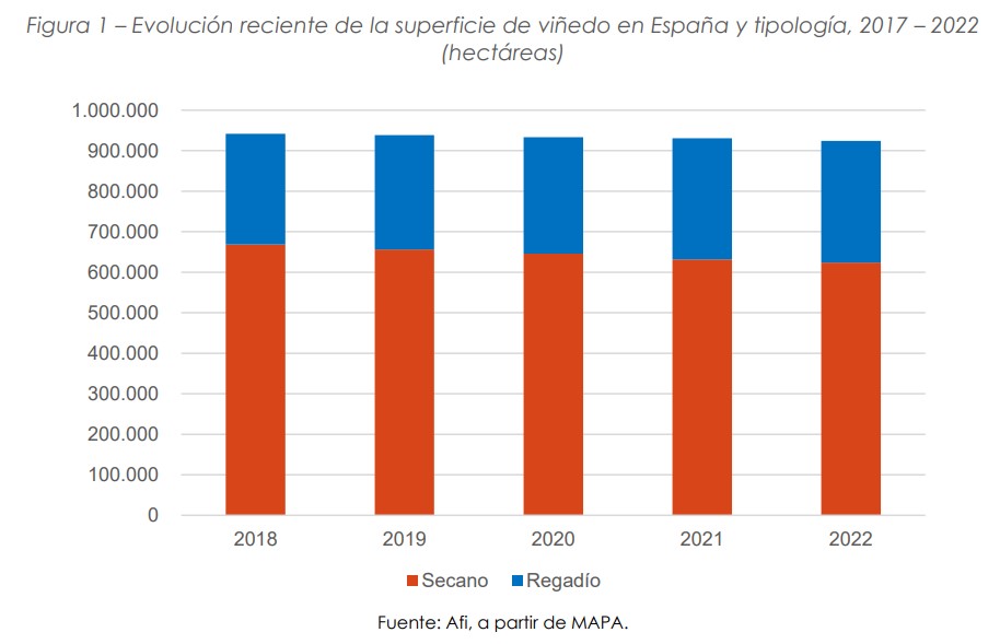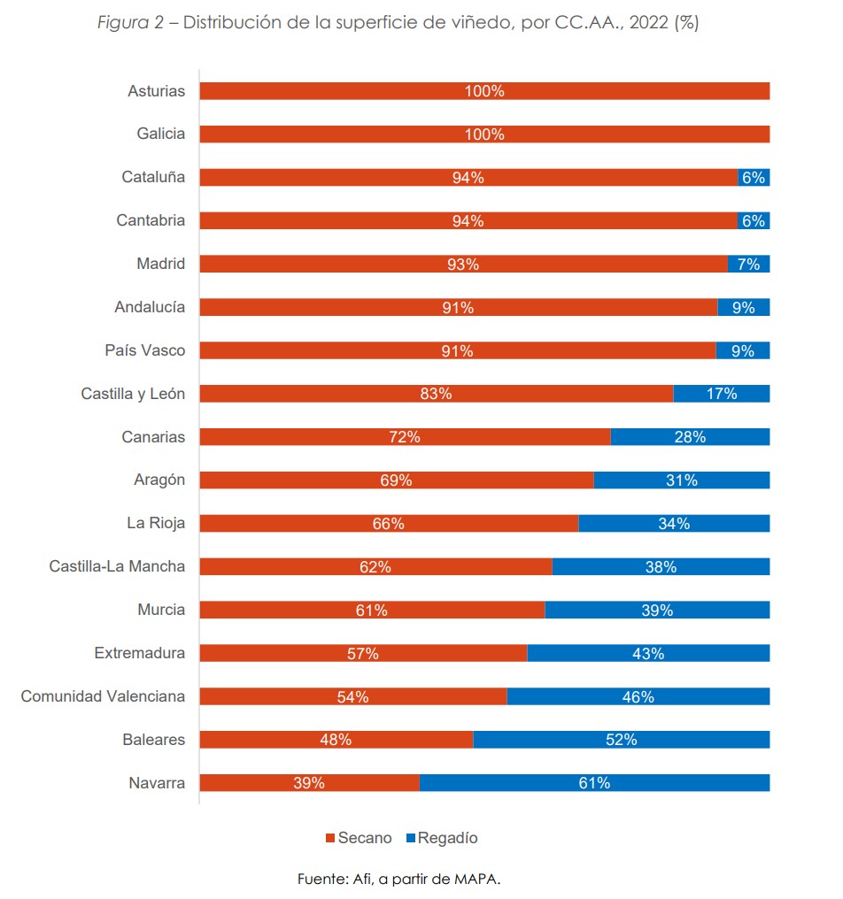 Un aspecto notable del cultivo vitivinícola en España es la predominancia de viñedos de secano, aunque las condiciones climáticas han incrementado la necesidad de apoyo hídrico en algunas regiones. La mayoría de las comunidades autónomas españolas tienen más superficie de viñedo de secano que de regadío, con excepciones notables en las Islas Baleares y Navarra.