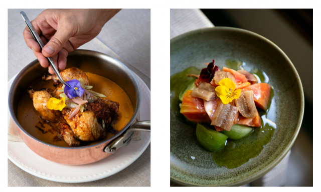 Vieiras con consomé de cebolla asada, ceps y trufa blanca/Bogavante al carbón /Codornices a la antigua / Ensalada de tomates de temporada, encurtidos, sardina marinada y ahumada con aceite de hierbas.
