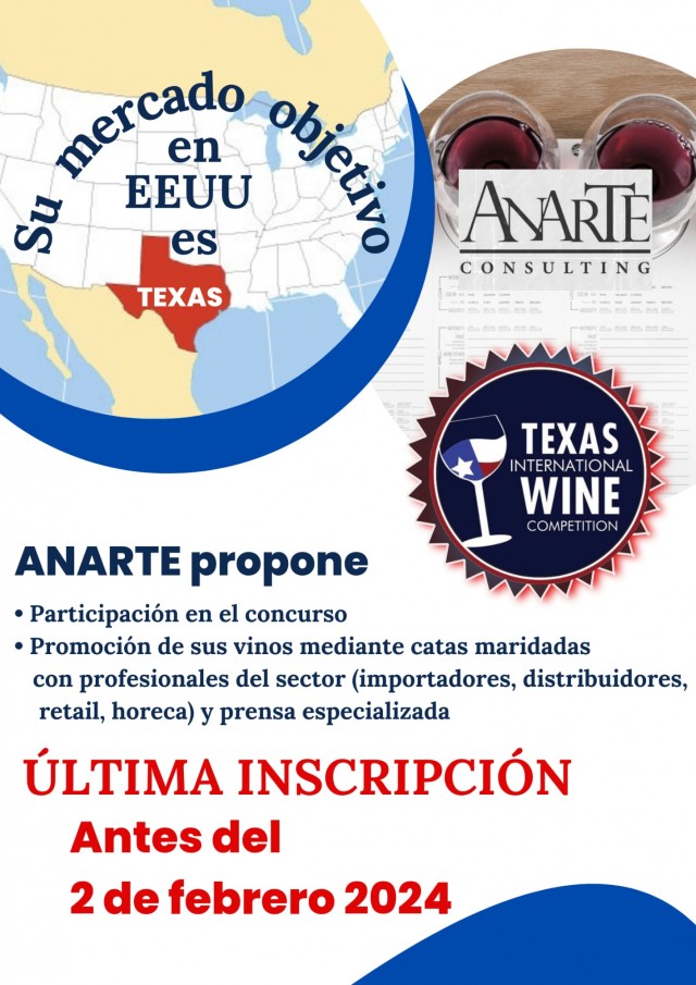 ANARTE LLC, consultora americana especializada en la promoción de vinos españoles en el estado de TEXAS (USA), amplía el plazo de inscripción para la participación en el concurso TEXAS INTERNATIONAL COMPETITION (TXIWC) que tendrá lugar en la ciudad de Austin el próximo 23 de marzo en su edición del 2024.