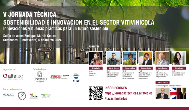 Alfatec Ingeniería y Consultoría, especialista en el diseño de proyectos para bodegas con el enfoque en la sostenibilidad, organizará una jornada técnica dedicada a la sostenibilidad e innovación en el sector vitivinícola. El evento tendrá lugar el próximo 5 de marzo en el salón de actos de Bodegas Martín Códax, ubicada en Cambados, Pontevedra.