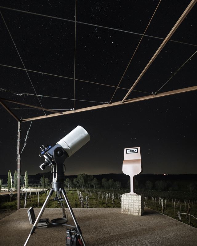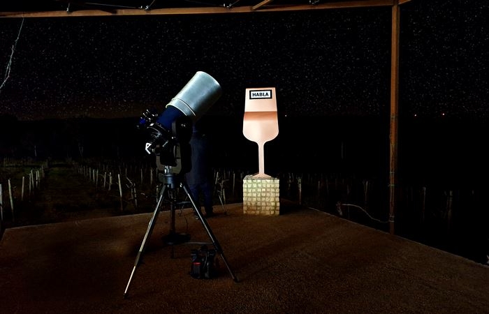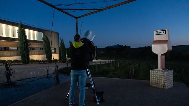 La experiencia arranca en el exterior de la bodega, en el Mirador del Duende, que mira hacia la parcela en la que se cultiva Sauvignon Blanc, variedad con la que se elabora su vino HABLA Duende con crianza en barrica mientras el visitante conoce al equipo que dirigirá la experiencia astronómica. Tras una primera observación al telescopio, es momento de conocer el trabajo de Bodegas HABLA. Un recorrido por sus instalaciones nos lleva a descubrir el trabajo y filosofía de la bodega, la cual arranca en el año 2.000, y es la de crear un concepto de cultura del vino fácil y sencillo de entender acompañado por unos vinos de "lujo asequible", es decir, de gran calidad, personalidad única y accesibles a todo el mundo. Recorremos la sala de elaboración, la espectacular zona de crianza, precedida esta por una sala donde nace Esencia, su vino más emblemático. Barricas y fudres al abrigo del silencio, del sosiego y la oscuridad que perfilarán los vinos de las diferentes variedades y parcelas que cultivan en las 200 ha. que rodean Bodegas HABLA y que en última instancia terminará su proceso de crianza y afinado en el botellero hasta el momento óptimo de salir al mercado.