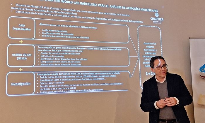 Con estos dos productos, Francois Chartier realiza un análisis de ambos para identificar los aromas moleculares que estos poseen. Tras numerosas catas organolépticas a diferentes temperaturas, varios análisis, como el de calibración, el de extracción de moléculas o le de identificación de moléculas, entre otros, el resultado es una amplio abanico de aromas que van desde piña, plátano, patata cocida, copos de coco, chocolate, hierba verde, trufa, jengibre,..etc. hasta un total de más de 100 aromas identificados. Esto permite crear el ADN gastronómico de los quesos y así identificar aquellos otros alimentos o bebidas que comparten las mismas moléculas aromáticas para crear el maridaje perfecto, en el que el resultado de la experiencia de combinar productos afines, 1+1, no sea igual a 2, sino a 3, o incluso más, elevando la experiencia a un grado superior que si se degustaran solos o con una combinación que molecularmente no estuvieran en la misma línea aromática.