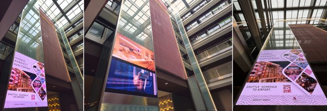 En un esfuerzo por ofrecer experiencias visuales inmersivas y de alta calidad, el Madrid Marriott Auditorium Hotel & Conference Center ha instalado recientemente videowalls en cada uno de sus 2 atrios. Cada videowall cuenta con una pantalla LED de alta calidad, con una resolución 4K de 3072 x 3456 píxeles, proporcionando imágenes nítidas y vibrantes que cautivarán a todos los visitantes.