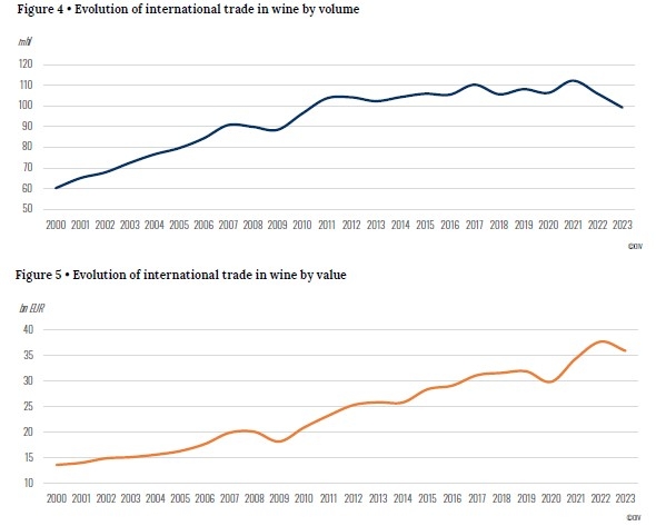 El comercio internacional de vino también se redujo en volumen, con una caída del 6,3%, alcanzando los 99 millones de hectolitros, aunque el valor de las exportaciones se mantuvo alto, con 36 mil millones de euros. El precio promedio por litro de vino exportado alcanzó un récord de 3,62 euros. Italia, España y Francia continuaron siendo los mayores exportadores por volumen y valor, aunque experimentaron descensos en sus exportaciones. En el hemisferio sur, Chile, Australia y Sudáfrica sufrieron fuertes caídas en sus exportaciones debido a menores cosechas.
