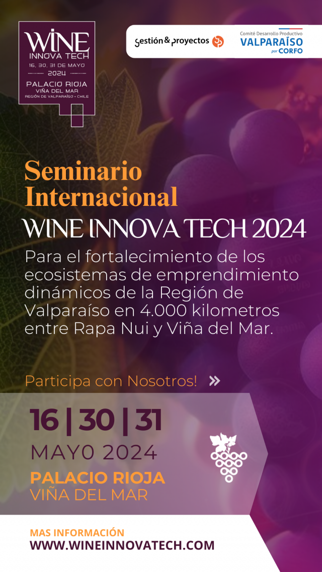 En el marco del Seminario internacional Wine Innova Tech 2024, los días 16, 30 y 31 de Mayo, se anunció la creación del Primer Hub Vitivinícola Virtual llamado "Valparaíso Wine Region", instancia pionera en Chile y sudamérica, que será liderada por la empresa Turingo, partner estrategico del W.I.T. 2024.