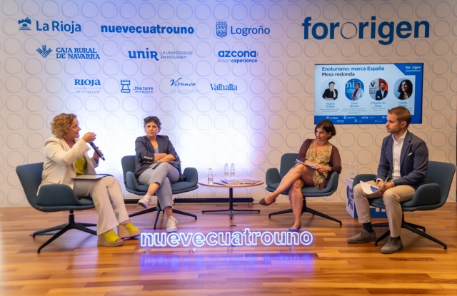 En la segunda mesa redonda se ha hablado del enoturismo como marca España. En ella han participado Virginia Borges, directora general de Turismo y Promoción Territorial del Gobierno de La Rioja; Chelo Miñana, directora del Máster en Formación Permanente en Enoturismo de UNIR; Eduardo de Diego, de la Federación Española del Vino, y Natalia Briales, jefa de Área de Márketing Web y Contenidos de Turespaña.