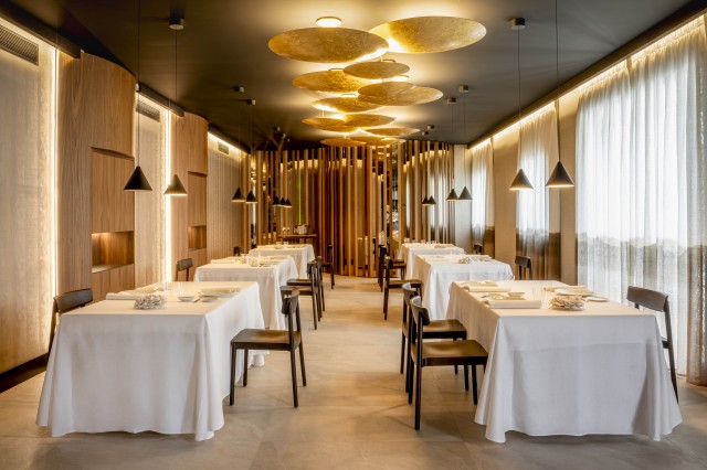 El gran restaurante, imaginado por Granda y que ha sido capaz de dar forma justo ahora, y no antes, gracias a la experiencia acumulada como sumiller, camarero, gestor de equipos y creador de conceptos, se aprecia desde que se cruza el umbral. Entonces se accede a la bodega para disfrutar del primer pase; los snacks se degustan en un segundo espacio: la cocina, amplísima y con un gran pase. Y una vez se ha tomado asiento, continúa la vivencia a través de los diferentes pases del menú en el salón principal, con capacidad es para 18 personas, y un privado para 12. Existe, además, el área de I+D en el que además se desarrollarán experiencias diseñadas al milímetro atendiendo a las necesidades del cliente.