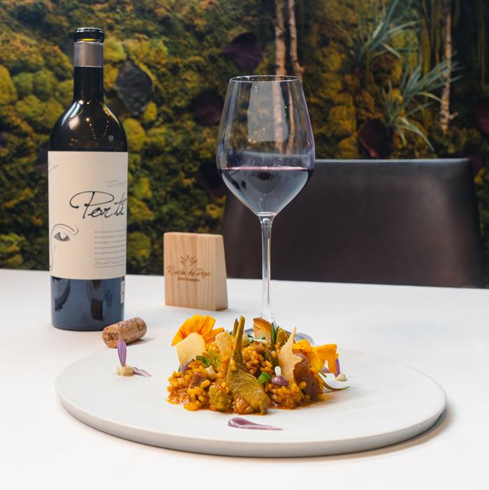 'Por Tí' es un vino destacado por su complejidad y elegancia, elaborado con uvas seleccionadas de la región de Jumilla. Sus notas de frutas rojas maduras y su equilibrio hacen que sea el acompañante perfecto para el plato preparado por Ginés Nicolás Fernández. Este arroz meloso emplea arroz de Calasparra, un grano corto con Denominación de Origen Protegida, reconocido por su calidad superior y sabor distintivo. El chato murciano, una raza de cerdo autóctona de la región que ha sido recuperada de la extinción, aporta un sabor profundo y rico al plato, mientras que las verduras de temporada y las hierbas locales añaden frescura y matices aromáticos que resaltan la esencia de la cocina mediterránea.
