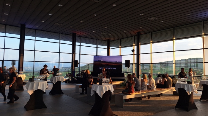 El sol se oculta en el horizonte bajando entre un mar de viñas creando una bucólica escena. Mientras, el espectáculo de magia a cargo del mago Iceman ameniza a los presentes. Los trucos de suceden entre bocado y bocado. Un servicio de cóctel muy cuidado y bien elaborado para disfrutar de la gastronomía de la zona con tapas variadas. Espirales Cósmicos, un canutillo de pan miel de pescados y langostinos salvajes, lechuga y mahonesa de limón, Rocas de Croquetas, croquetas artesanas de chuletón a la brasa, o Explosión de Sabores, un huevo roto relleno de crema de setas, trufa de montaña alavesa con su yema, por citar alguna de las diferentes propuestas que con su nombre hacen alusión al motivo de celebración uniendo el cielo y la tierra. Además de varios puestos en los que también disfrutar de más tapas elaboradas en vivo. Un cóctel con tapas muy variadas, de gran calidad y en abundante cantidad, tanto saladas como dulces, que se mantuvo durante gran parte del evento.