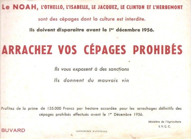 En Francia, la prohibición de seis variedades híbridas (Clinton, Noah, Isabelle, Jacquez, Herbemont y Othello) se implementó en 1934 a nivel nacional. Esta medida fue una respuesta tanto a la sobreproducción de vino como a la defensa de la calidad vinícola francesa frente a las nuevas reglas de las Denominaciones de Origen Controladas (DOC). Se argumentó que estas variedades, a pesar de su resistencia a enfermedades, producían vinos de mala calidad con sabores desagradables y niveles potencialmente peligrosos de metanol. A pesar de las prohibiciones, los viticultores siguen produciendo vino para uso familiar.