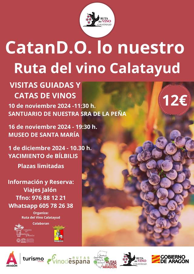 Por otro lado, "CatanD.O. lo nuestro" es la segunda gran propuesta de la Ruta del Vino Calatayud, un ciclo que combina visitas guiadas a monumentos con catas de vinos de la D.O. Calatayud. El 10 de noviembre, se organizará una visita al Santuario de Nuestra Señora de la Peña, seguida de una cata de vinos en la explanada. El 16 de noviembre se llevará a cabo una visita al Museo de Santa María, donde se ofrecerá una degustación de vinos en el claustro de la Colegiata. Finalmente, el 1 de diciembre se visitará el Yacimiento de Bílbilis, un importante enclave arqueológico de la época romana, acompañado también de una cata de vinos.